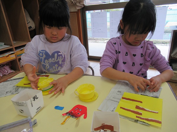 最後は、折り紙で鬼のパンツの模様を作って牛乳パックに貼りました。