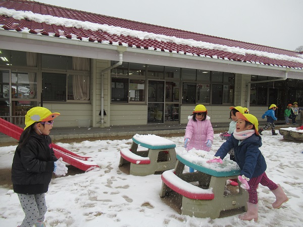 園庭に雪が降り積もる様子を見て、「お外で遊ぶ?」「雪合戦する?」と朝から担任に質問攻めのろけっと組さん。