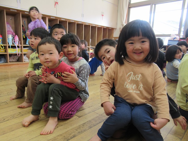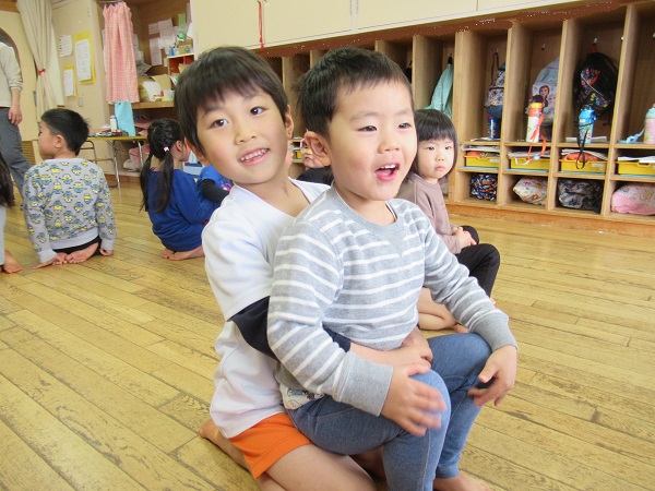 膝取りゲームでは、ろけっと組さんが椅子になり、ギューッとみかん組さんを抱っこ❤