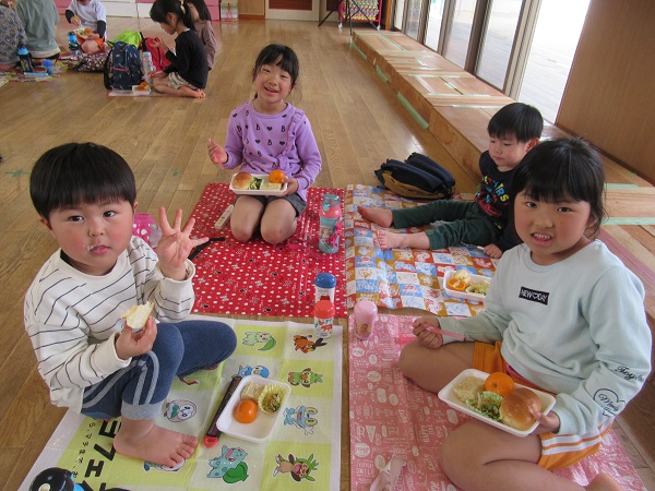 遊戯室でシートをくっつけて、嬉しく、美味しいランチタイムとなりました。