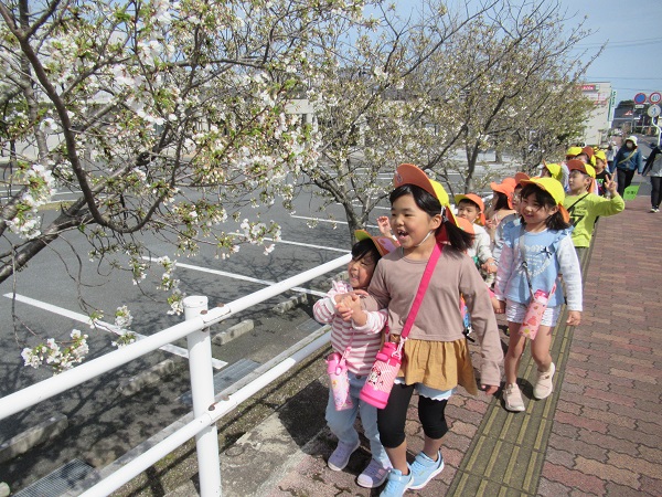 図書館横の桜が咲き始めているのを、嬉しそうに見ながら歩きました。
