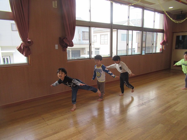両手を水平に保って走り、音楽に合わせて足をあげてピタッと止まります。