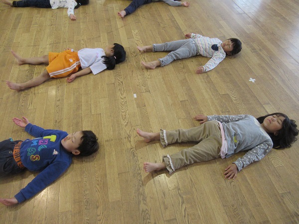ヨガとダンスでたっぷり体をほぐした後は、床に大の字になって寝転んで全身の力を抜いて休みました。
