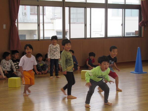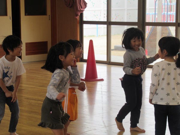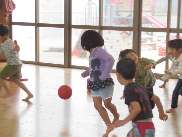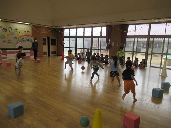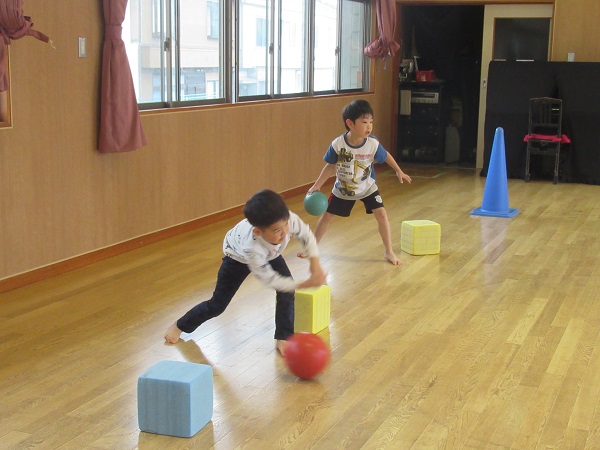 ボールが当たって外野に出た子は、お友だちが進みそうな方向を狙ってボールを転がします。