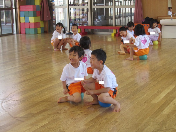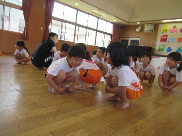 まずはみんながよく知っている「だるまさんがころんだ」を、「だるまさんがしゃがんだ」「だるまさんがジャンプした」など様々なバージョンで楽しみました。