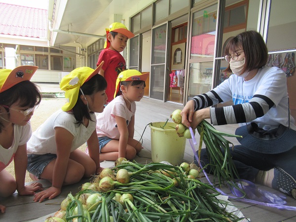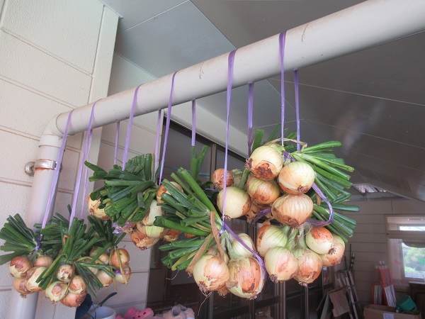 先日収穫した玉ねぎを畑側のテラスから園庭へ運びました。