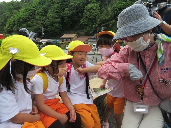 所々で「銀山かるた」の挿絵と見比べながら、親しみを持ってガイドさんのお話を真剣に聞くろけっと組さんでしたよ。