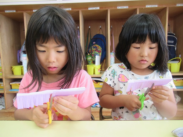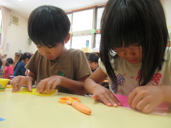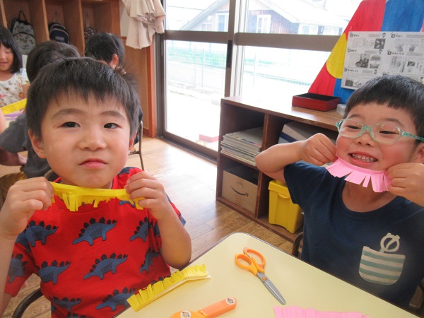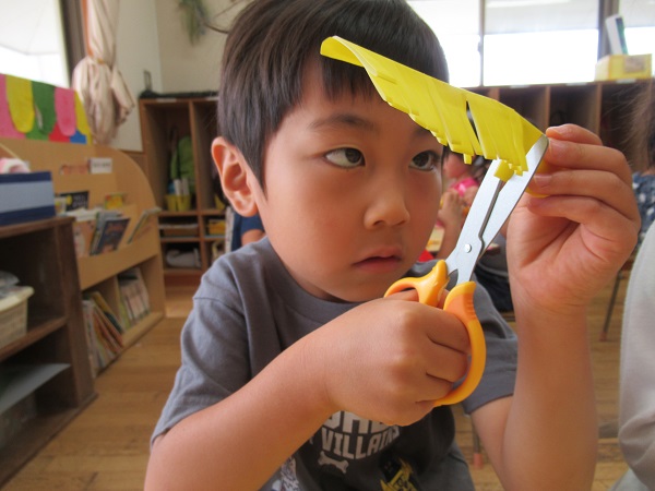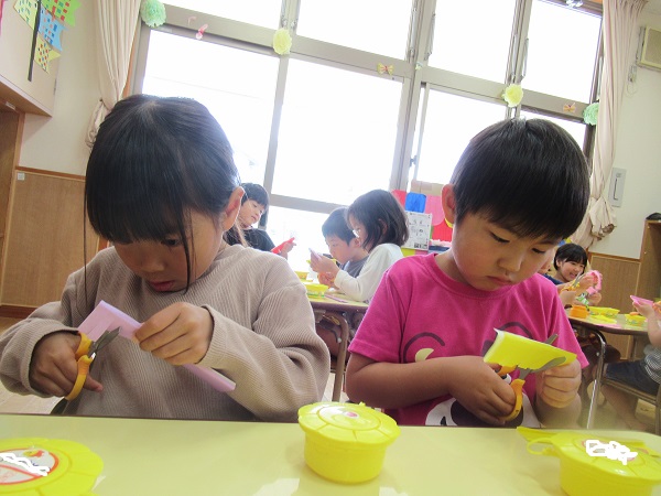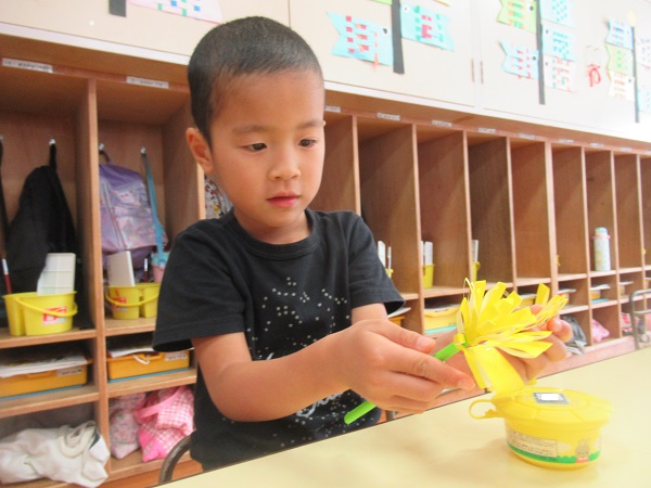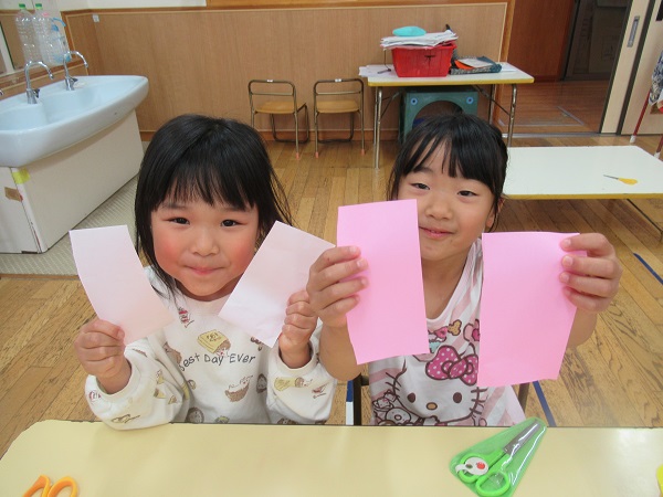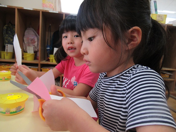 2021年05月21日 flower折り紙を使ってお花を作りました。まずは好きな色の折り紙を選んで・・・半分に折ってハサミで切ります。「半分にできたよ~!!」それをさらに半分に折って、細かく切り込みを入れていきました。みんな全集中!!とっても真剣に切っていました。「見て~!!おひげみたい■」最後の仕上げは、先日作った緑の棒(茎)に巻きつけていきました。クルクルクル・・・素敵なお花ができました■