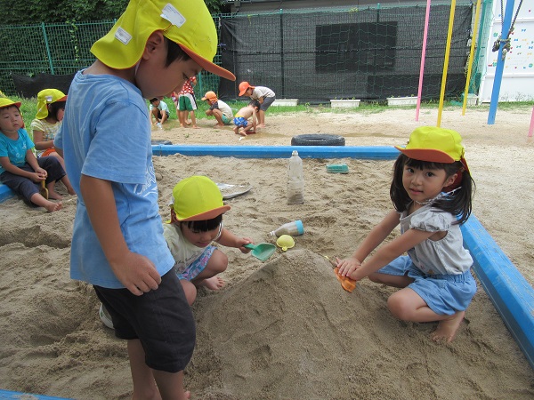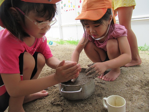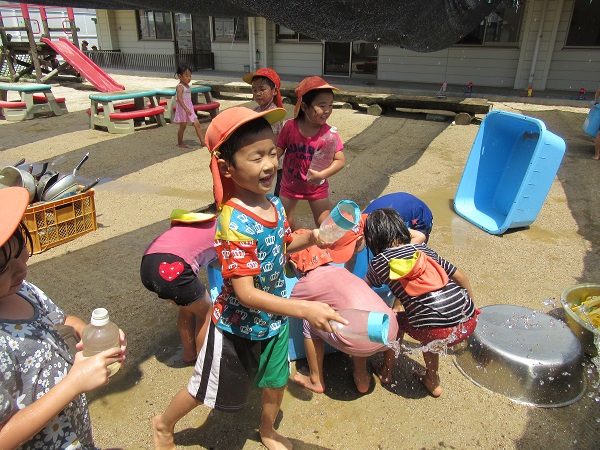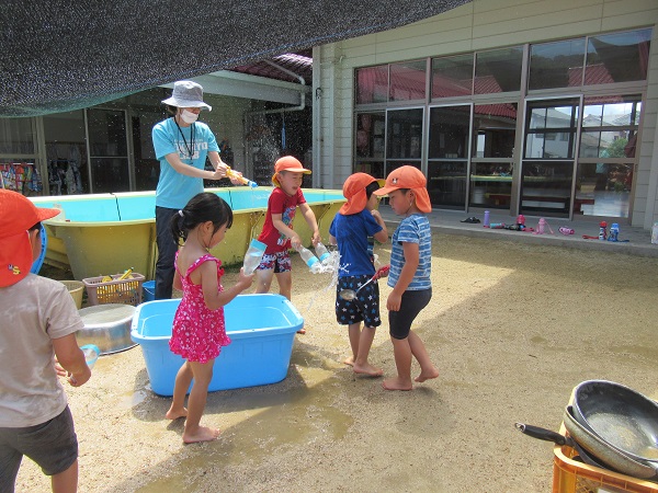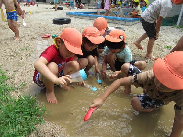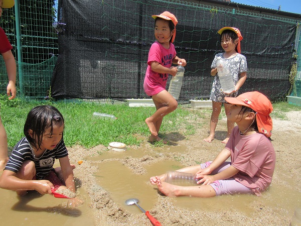 2021年07月13日 思いっきり!昨日の雨が嘘のように晴れた一日となりました。少しだけ夏まつりの練習をした後、思いっきり水遊びを楽しみましたよ■■今日は担任も一緒に、お互いびしょ濡れになるほど水をかけ合いましたよ!!泥水の池はあったかくて、まるで温泉みたい■「もっと深くしよう!!」と、一生懸命掘っていました。砂場ではお山を作ったり、泥団子を作ったり・・・♪たっぷり遊んで大満足✨夢中で楽しむろけっと組さんでした。