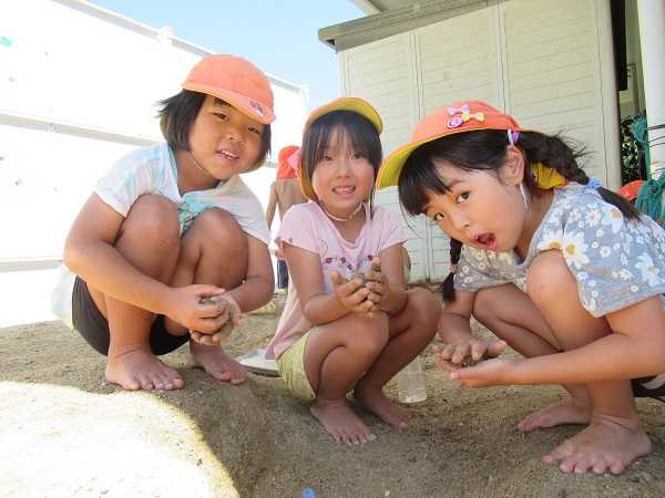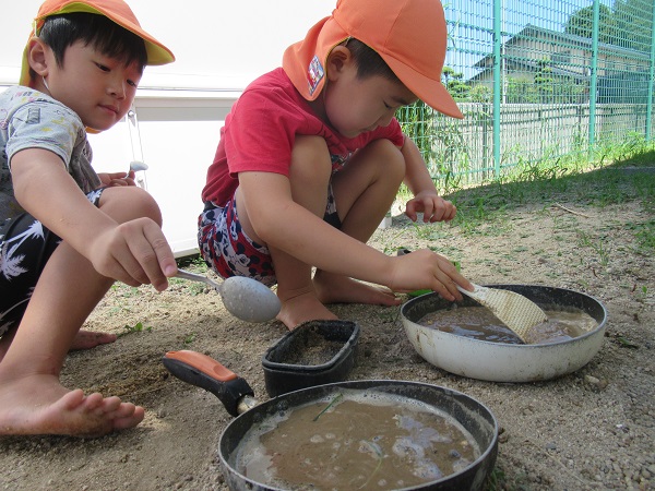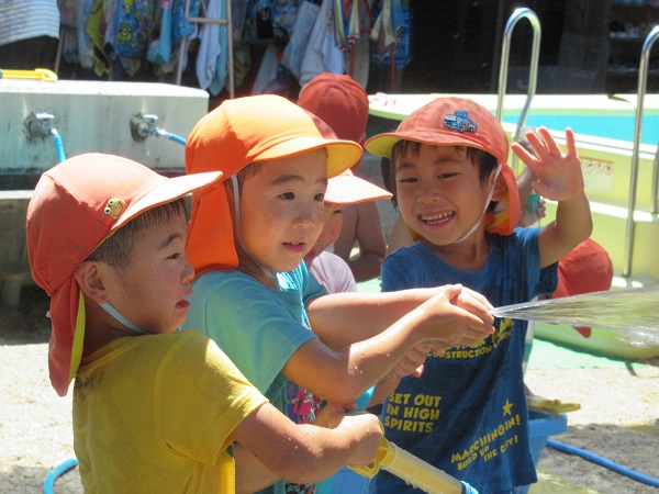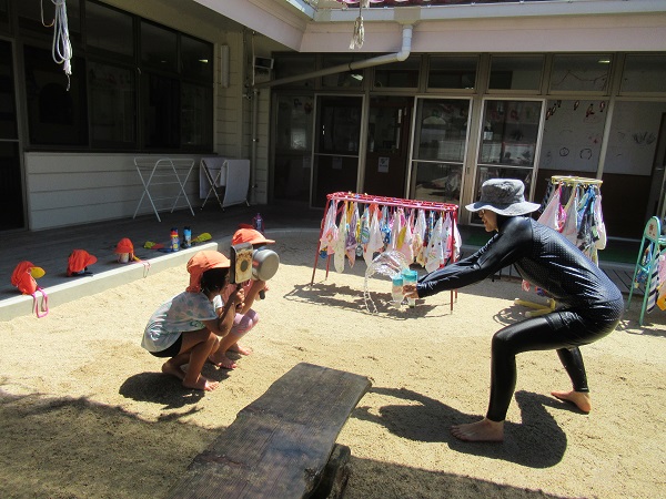 友だちと協力しながら、どうやって保育者に水をかけるか・・・試行錯誤しながら様々な道具を使って、上下左右色んな角度から狙ってきます✨(おかげでビチョビチョです■)
