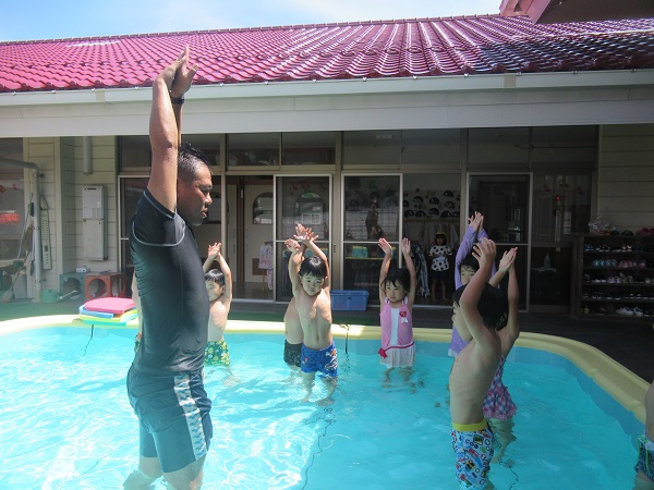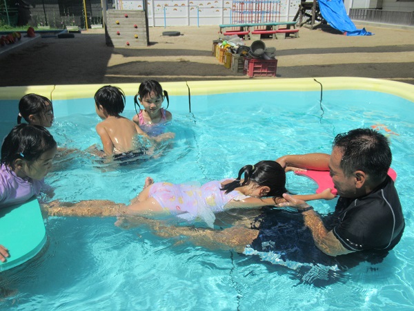 プール遊びでは、回数を重ねるごとに長い時間顔付けができるようになったり、手足を伸ばして蹴伸びができるようになったりと成長した姿を見せてくれている子どもたち。