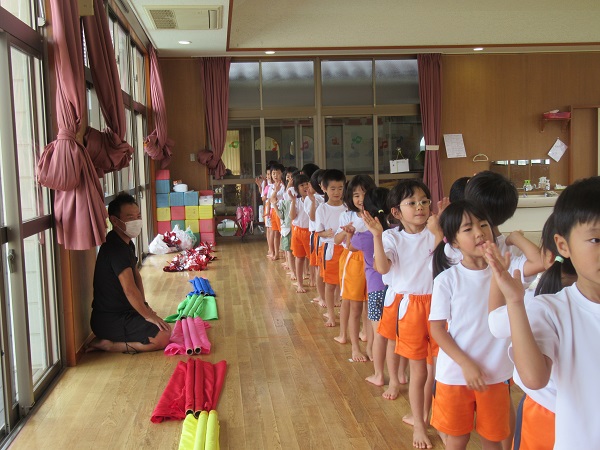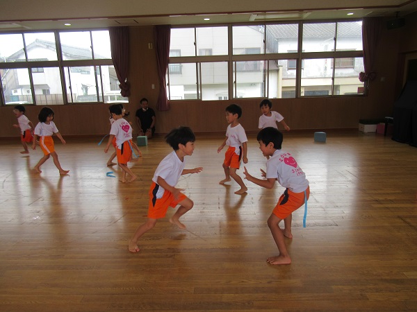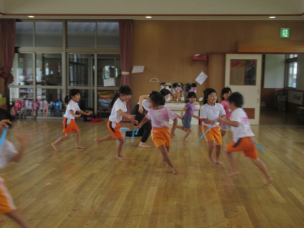 お尻に紙テープをぶら下げて、しっぽ取りをしました。