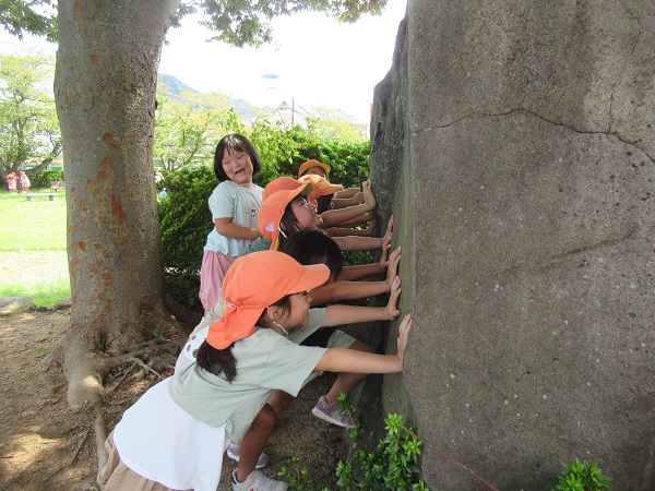 「動かせるかな?」と、大きい岩をみんなで押してみるろけっと組さん!!