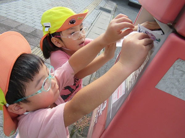 朝いちばんに近くのポストまで歩いて行き、一人ひとり、自分の書いた絵手紙をポストに投函しましたよ。