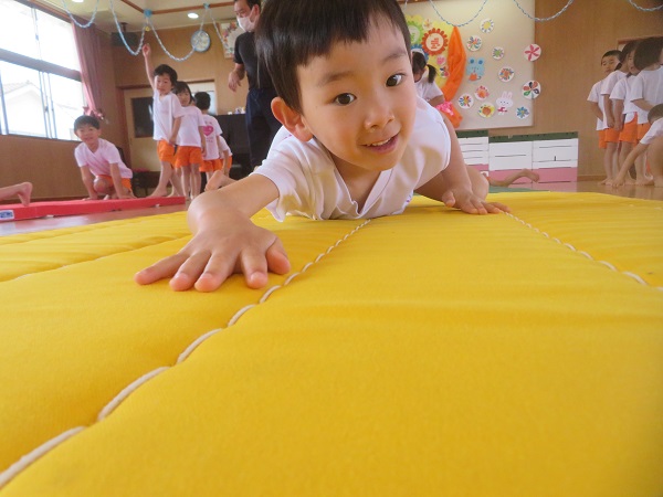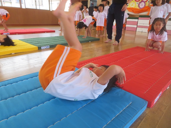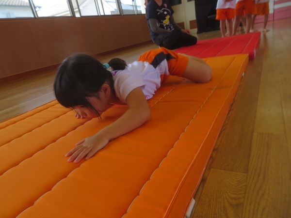 マット運動では、以前教えてもらった前転をしました。