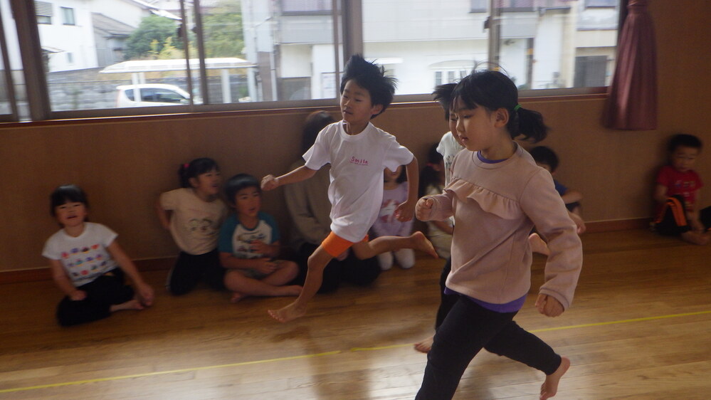 ルールは簡単!足ではなくお尻を使って積み木を周りをまわって次のお友だちにタッチします!