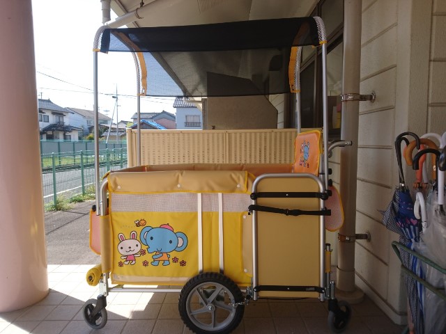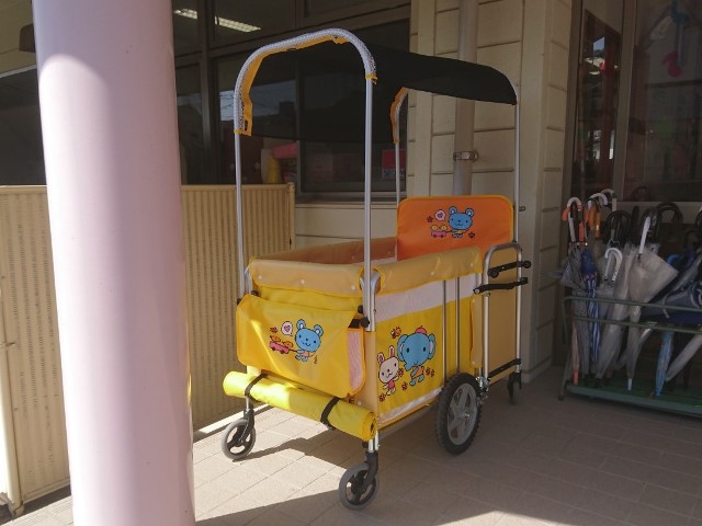 2019年04月18日 玄関前に避難車を設置しました。いざという時、小さい子どもさんがより安全・迅速に避難できるように、玄関前に乳児用避難車を設置しました。この避難車は散歩車としても活用します。これからも子ども達がより安心で楽しい保育園生活が送れるよう、環境を整えていきたいと思います。