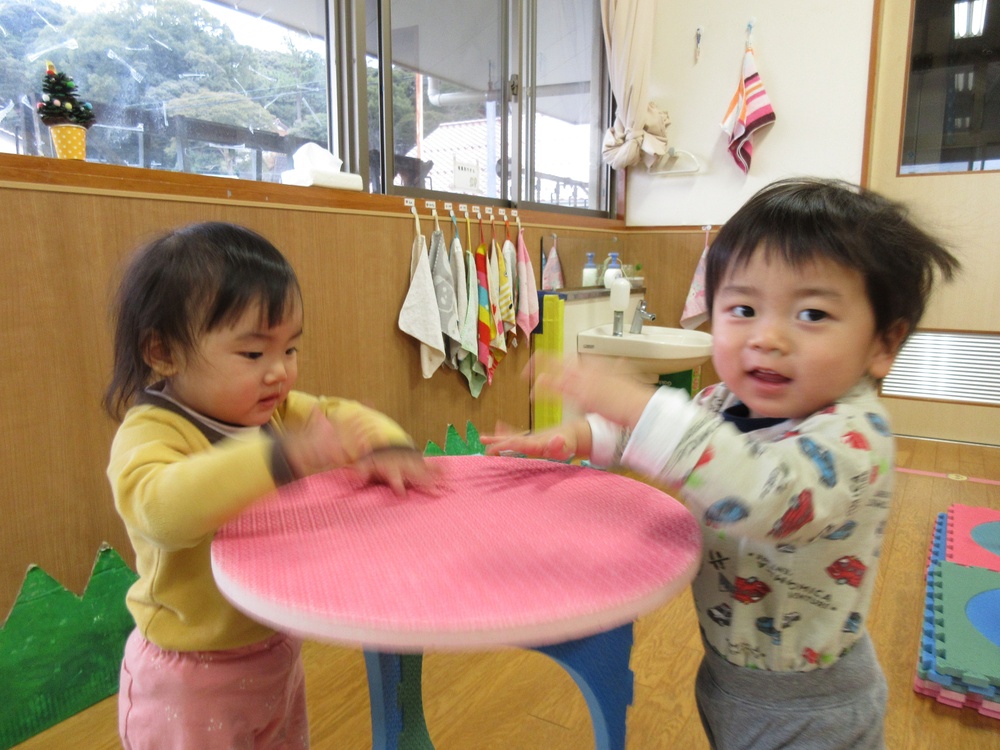 元気いっぱい! 2023年12月19日 お部屋でプラポイントで遊びました。つなげて汽車ごっこ! お家を作ると中からばぁ~! こちらは太鼓です。 ”さんぽ”の曲をかけると、元気いっぱい歩いていましたよ。 今日はひも通しにも挑戦しました。上手に通すことができていました。 ~もうすぐ誕生会&クリスマス会~ 誕生会&クリスマス会で歌う”赤鼻のトナカイ”のペープサートを見ました。 みんなも歌を口ずさみながら見ていましたよ。 楽しみだね♪