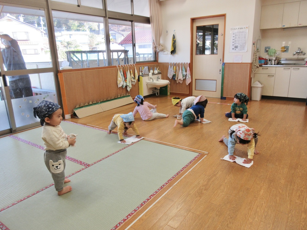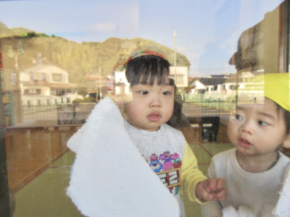保育者が一度手本を見せると、上手に真似て拭くことができました!