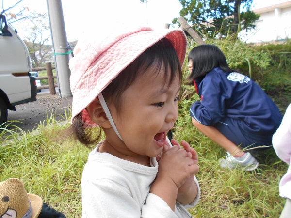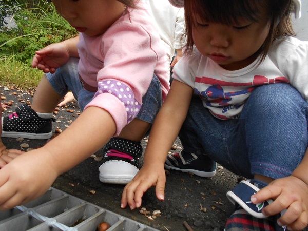 側溝の穴を見つけると、「ポトン♪ポトン♪」と言いながら、どんぐりを落として遊んでいました(笑)