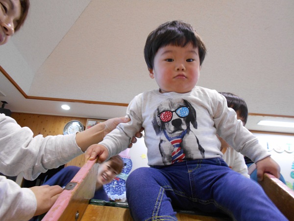 2017年11月22日 遊戯室で・・・♪遊戯室に行き、巧技台で遊びました■すべり台に登って・・・しゅぅ~■■■こっちは、はしごだよ♬またいだり、くぐったり・・・いちご組■さんの赤ちゃんに興味津々!!!じ~っっ!!!■最後はゲームボックスの上に集合したうさぎ組さん■何が始まるかな~と思いきや、そこはステージに早変わりし、みんなで「どんぐりころころ」を歌って踊って盛り上がっていましたよ♪気分はアイドル■なうさぎ組さんなのでした■