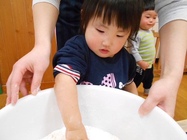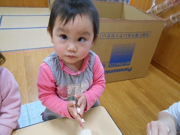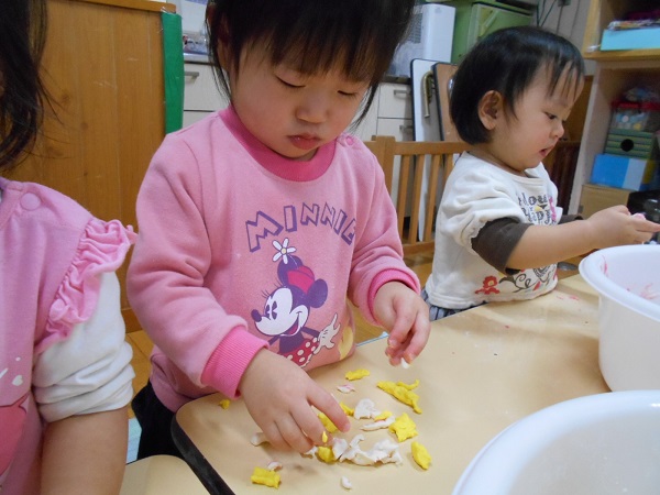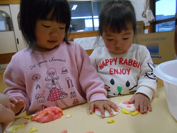 2018年01月10日 ころころ、こねこね☆火災を想定した避難訓練をしました。静かに、上手に避難できましたよ。その後は初めての小麦粉粘土遊びをしましたよ!小麦粉ってさらさらなんだね~✨そこに、食紅・塩・サラダ油・水を混ぜると小麦粉粘土に変身☆小麦粉粘土を丸めたり・・・小さくちぎったり手のひらで叩いて、薄くのばしたり握ったり手にくっついちゃった!❤夢中になって遊んでいたのでした■