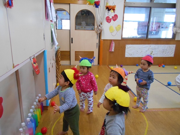 2018年02月01日 鬼が来るぞー!!!出来たての鬼の帽子をかぶり、ご機嫌なうさぎ組さん♪明日、何が起こるのか、まだ誰も知りません(笑)明日の節分会に備えて、豆まきの練習です☆お腹の中の悪い鬼をやっつけるぞ~!!こわい・・・・・■えいっ!!!とっても頼もしいうさぎ組さん■明日もきっと大丈夫・・・・・(笑)その後、久しぶりに大田市駅までお散歩に行きました♪ぽかぽか陽気でとっても気持ちよく、たくさんのおしゃべりが聞こえていましたよ■