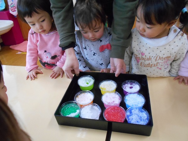 溶けだした色水が混ざって、虹色になりました☆