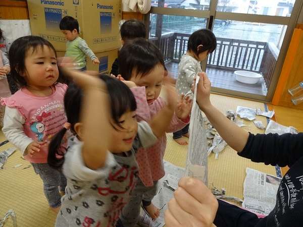 2018年03月05日 しんぶんし☆今日はお部屋で新聞紙遊びをしましたよ♪新聞紙をちぎって・・・こんなに小さくなっちゃった■グーの手を作って、アンパーンチ☆新聞紙のおばけ・・・怖いよー■新聞を広げて、記事に釘付けです(笑)室内遊びをいっぱい楽しんだうさぎ組さんでした☆