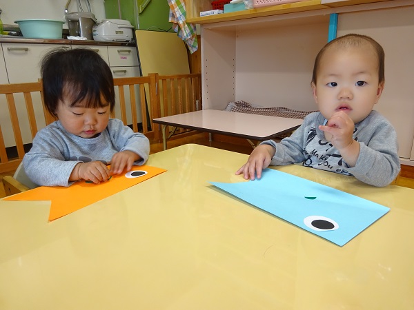 2017年05月01日 もう一つのこいのぼり♪毎日の遊びの中で、シールを剝がすのが大好きなうさぎ組さん。カリカリとシールを剝がしては、別の場所にぺったん♪シールをうろこに見立てて、こいのぼりを作りました♪かわいいこいのぼりができました☆手に持って、嬉しそうなみんなでしたよ♪