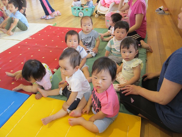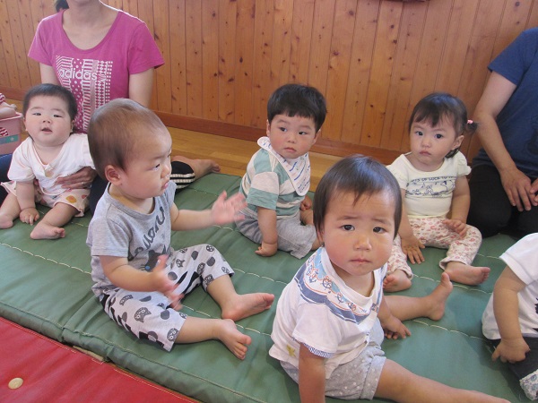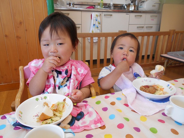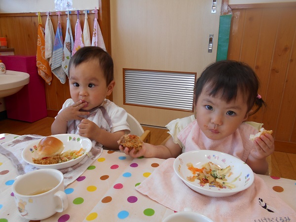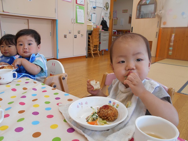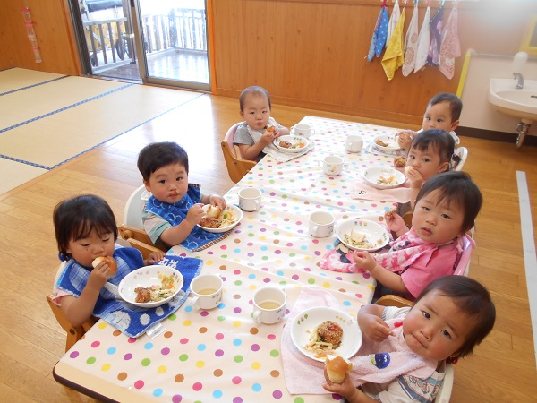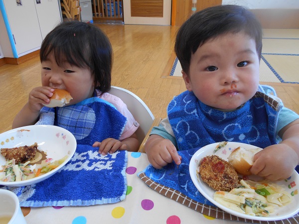 2017年05月25日 5月のハッピーバースデー☆今日は誕生会に参加しました。たくさんの人の中でちよっぴり緊張しながらも。「パチパチ☆」と手を叩いてお祝いしていましたよ♪一番のお楽しみは今日の給食!誕生会のごちそうメニューなので、テーブルクロスを敷いてのランチタイムを楽しみました☆食べることに夢中になるうさぎ組さん♪静かなひとときです☆「あ~おいしい♥」お腹も心も満たされて、幸せいっぱいのうさぎ組さんなのでした♥