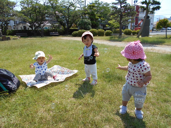 2017年05月29日 シャボン玉飛んだ♪市民会館で遊びました。シャボン玉を飛ばすと大喜びのうさぎ組さん♥「わ~い!」と手を伸ばしていましたよ♪小さな可愛いお花がいっぱい咲いていました♪たか~い所に「よいしょ!」と登ってみたり・・・ミストをかけてもらって大笑い☆「気持ちいい♥」笑顔でいっぱいの一日になりました■