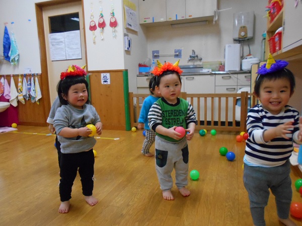 さあ、いよいよ明日は節分会■うさぎ組さんも小鬼に変身して豆まきの練習です!!