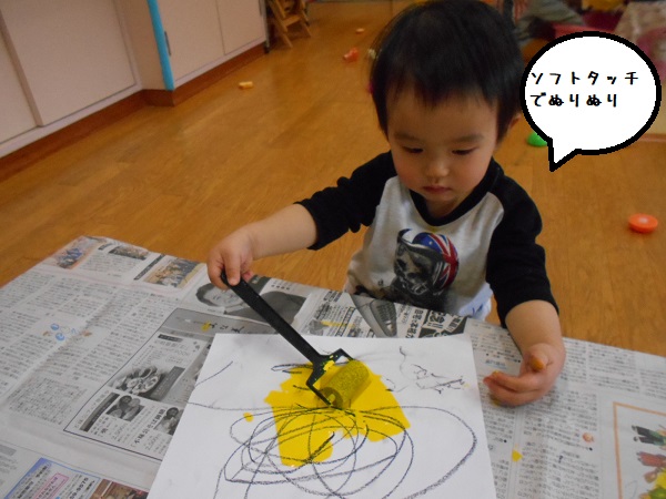 とっても力強く描くお友だちもいます。芸術は爆発だ~次はローラーで色塗りです。硬いクレヨンと違いローラーはスポンジ製なので、持ち手の力を上手に加減していました。