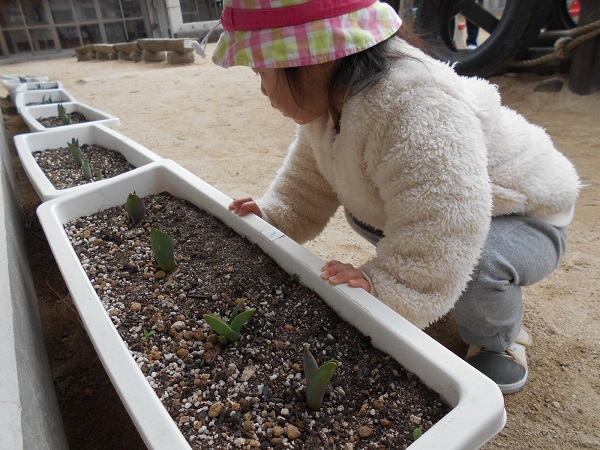 ひこうき組さんが植えたチューリップをじっとのぞき込んでいましたよ■