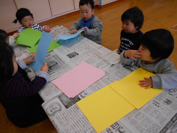 泣くことなく無事に終了しました。その後は画用紙と丸いシールを使った製作をしました。まずは子ども達に好きな色の画用紙を選んでもらいました。