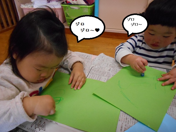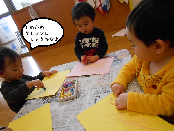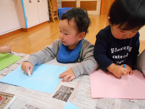 そして好きな色のクレヨンも選んで...なぐり描きをしました。お絵描きをする時は、とても真剣でとても集中する子ども達です。