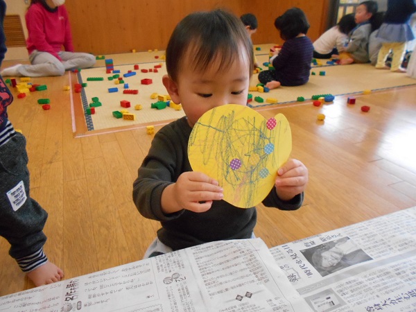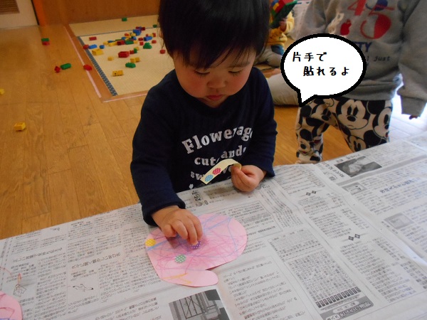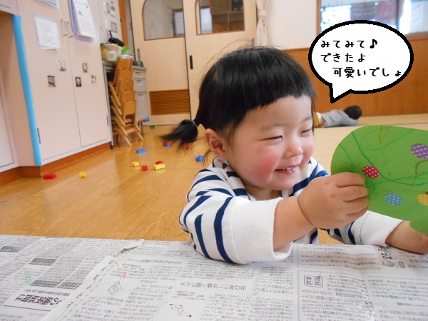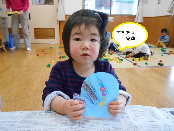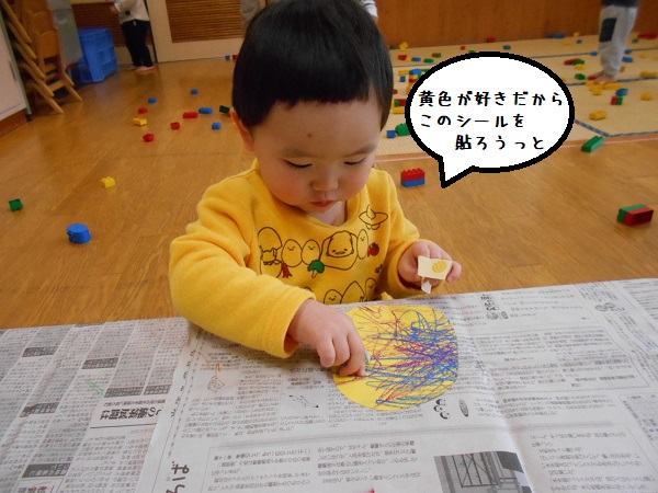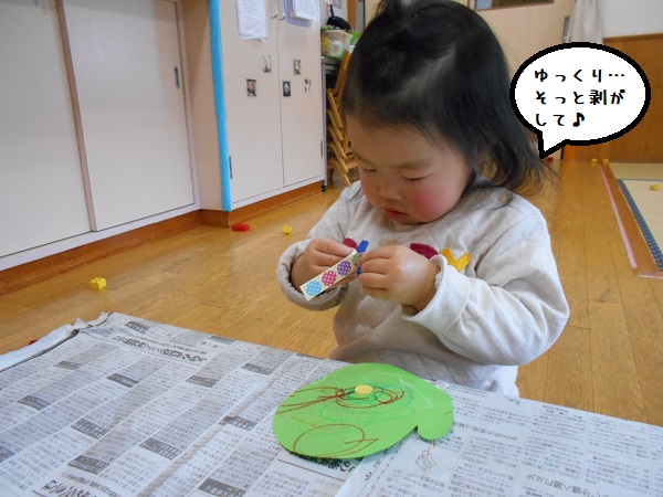次は丸い形のシールを貼ります。シールを台紙から剥がすことや貼る作業は、小さい子どもの手と指ではなかなか難しいものです。毎日の小さいことの積み重ねで、手先も大分器用になってきました。これも嬉しい成長です。