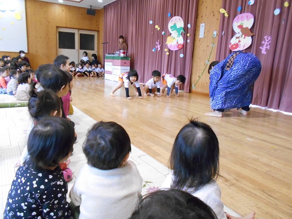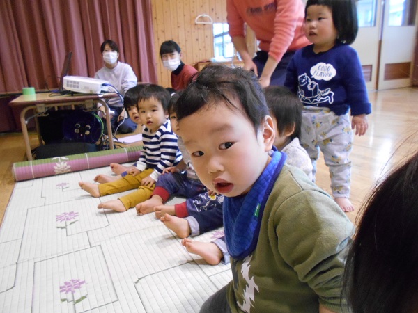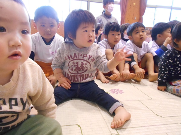 2019年02月06日 がんばれー!お楽しみ会のリハーサルを見に行きました!これから何が始まるのだろうと、興味津々■「静かに見ようね」「親方と力士、どっちが勝つのかな~」「頑張れー」音楽が流れると、つい踊り出してしまううさぎ組さん■幼児組のお兄さん・お姉さんかっこよかったね■給食を食べお腹がいっぱいになったみんなは布団に入ると夢の中・・・.どんな夢を見ているのかな?