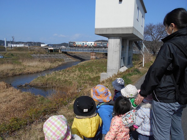帰りは川土手を歩きました。高架下から線路を見上げるうさぎ組さん☆