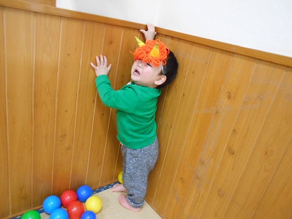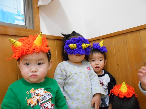 鬼の角で顔を隠して鬼を見ないようにしている、お友だちも(笑)