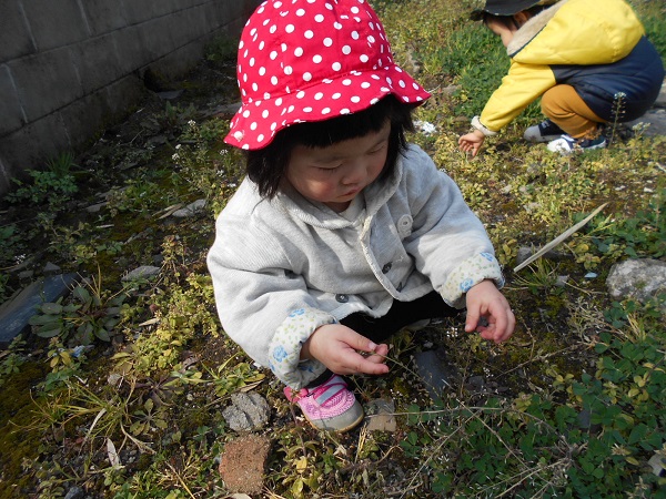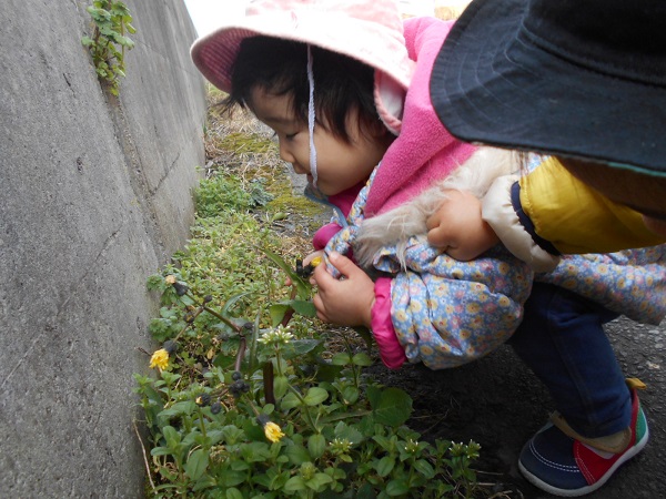 「黄色のお花だよ」と保育者が言うと「黄色」と繰り返し言う子ども達。