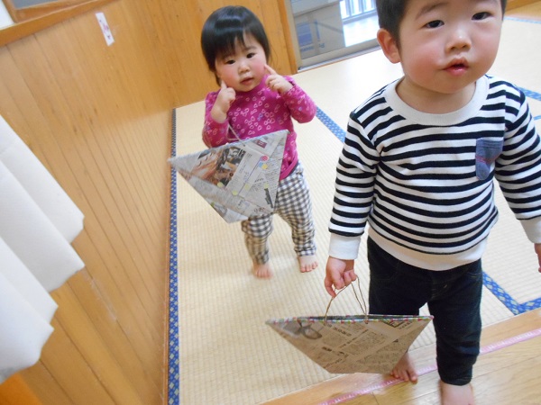 みんなでシール貼りをした鞄を渡すと、何だか嬉しそうなうさぎ組さん♪