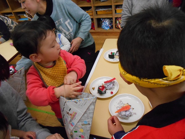 ばす組のお兄さん・お姉さんが優しく接客してくれ、とても楽しいお買い物ができたうさぎ組さんです。