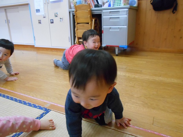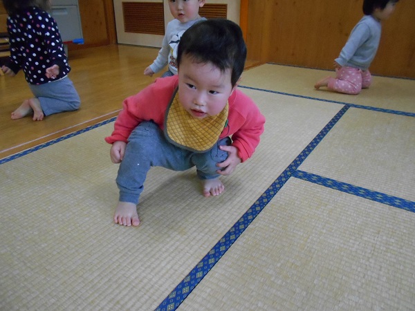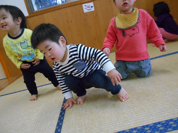はいはいのように手を付き、「いっちに、いっちに」と前に進みます。