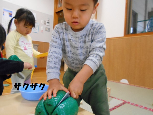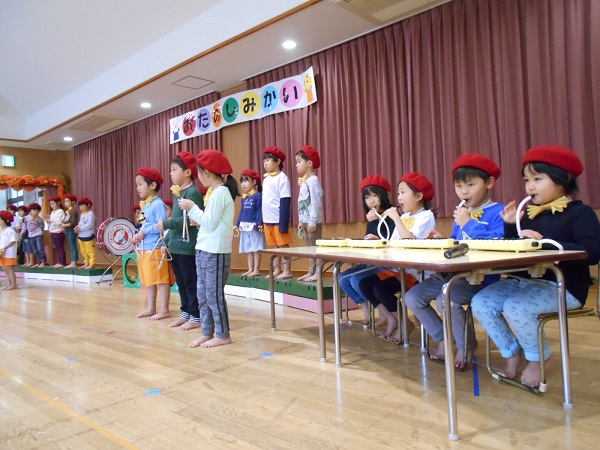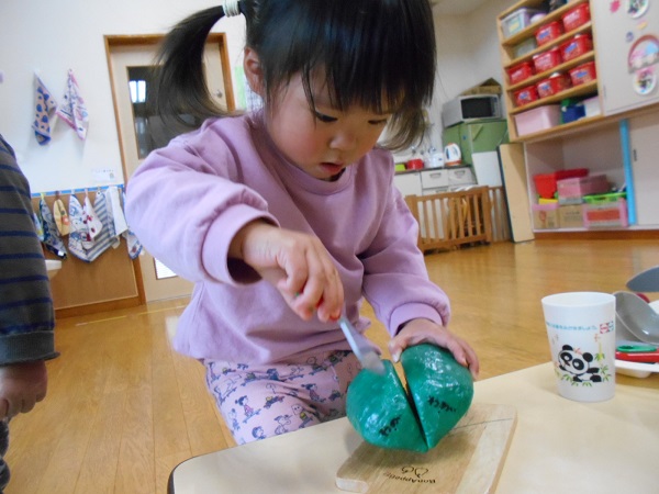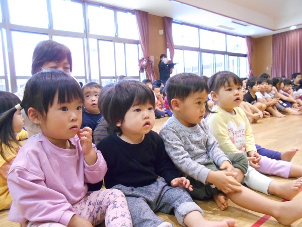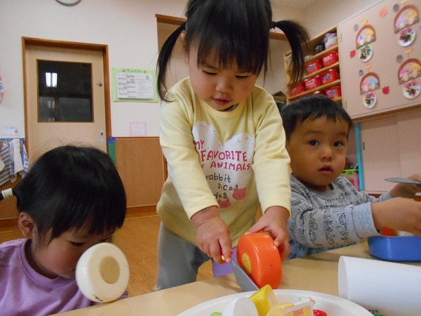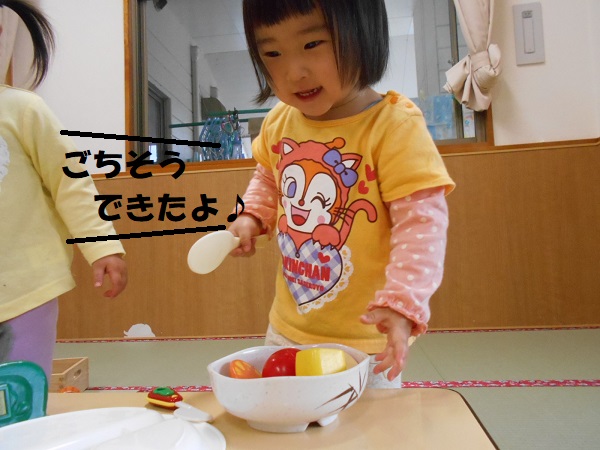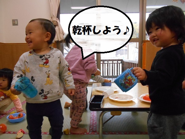 2020年12月11日 かっこいいな!明日はいよいよ”お楽しみ会”です。リハーサルを見に行きましたよ。ろけっと組のかっこいい姿に目が釘付けのうさぎ組さん!鬼の存在には敏感!鬼役の子を見つけて指さす子もいましたよ。リハーサルが終わった後はおままごとで遊びました。包丁さばきもバッチリ!野菜の切り方も上手になりました(笑)大きくなったらお母さんのお手伝いも上手にできるかな♪こちらでは宴会が始まりました。とっても楽しそうなうさぎ組さんでした。