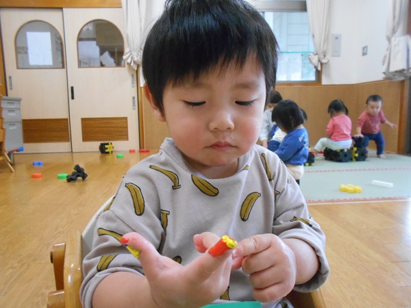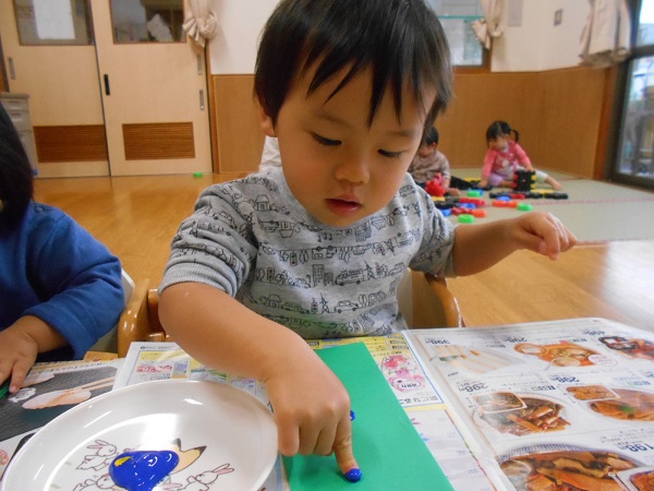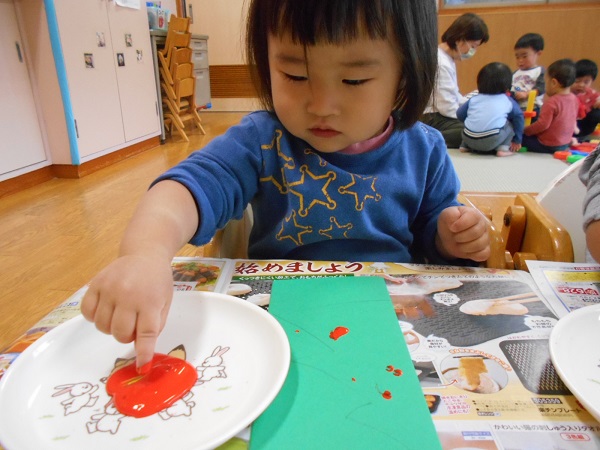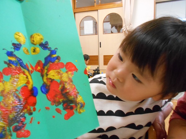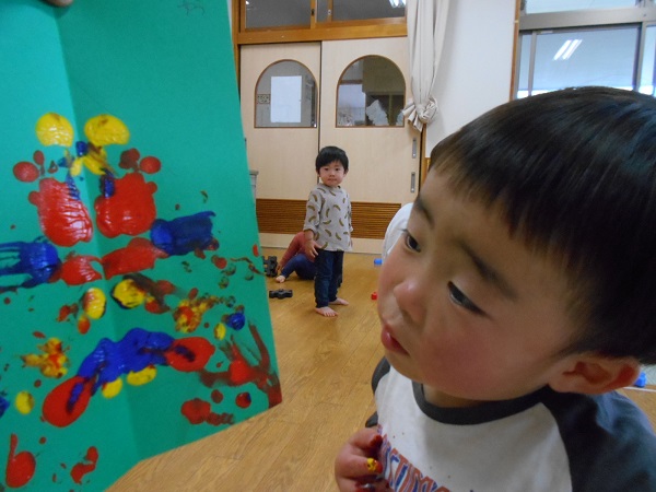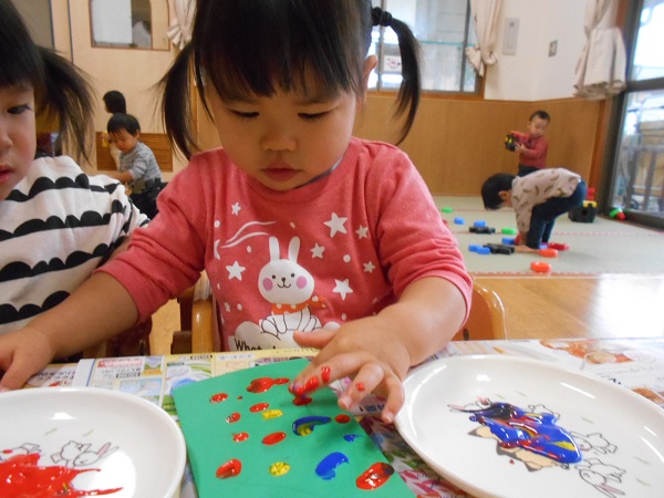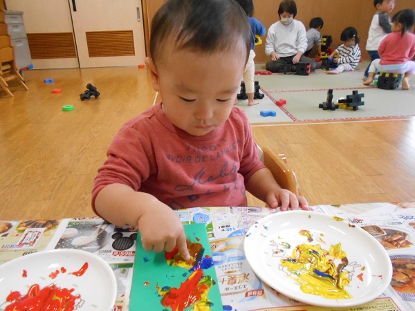 今までみんながしてきた指スタンプとは絵の具の量が違い、むにゅ~とした感触を楽しんでいましたよ☺