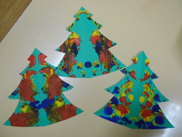 デカルコマニーという技法を使って、クリスマスツリーに色付けをしました!