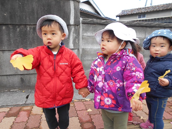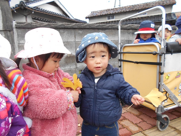 曇り空で少し風が冷たかったですが、元気いっぱいのうさぎ組さんは、帽子をかぶり、ジャンパーを着て出発!!