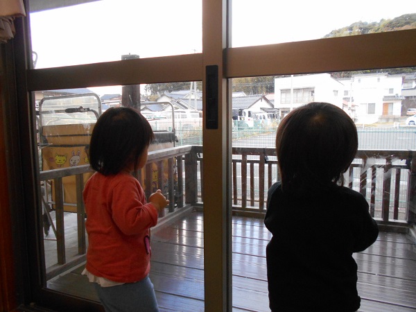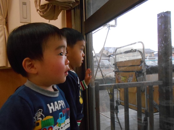 「ゆきだよー!」「お外が白くなってるねー!」と言うと、みんな窓に張り付いて雪が降っている様子を見ていました■